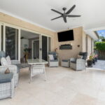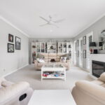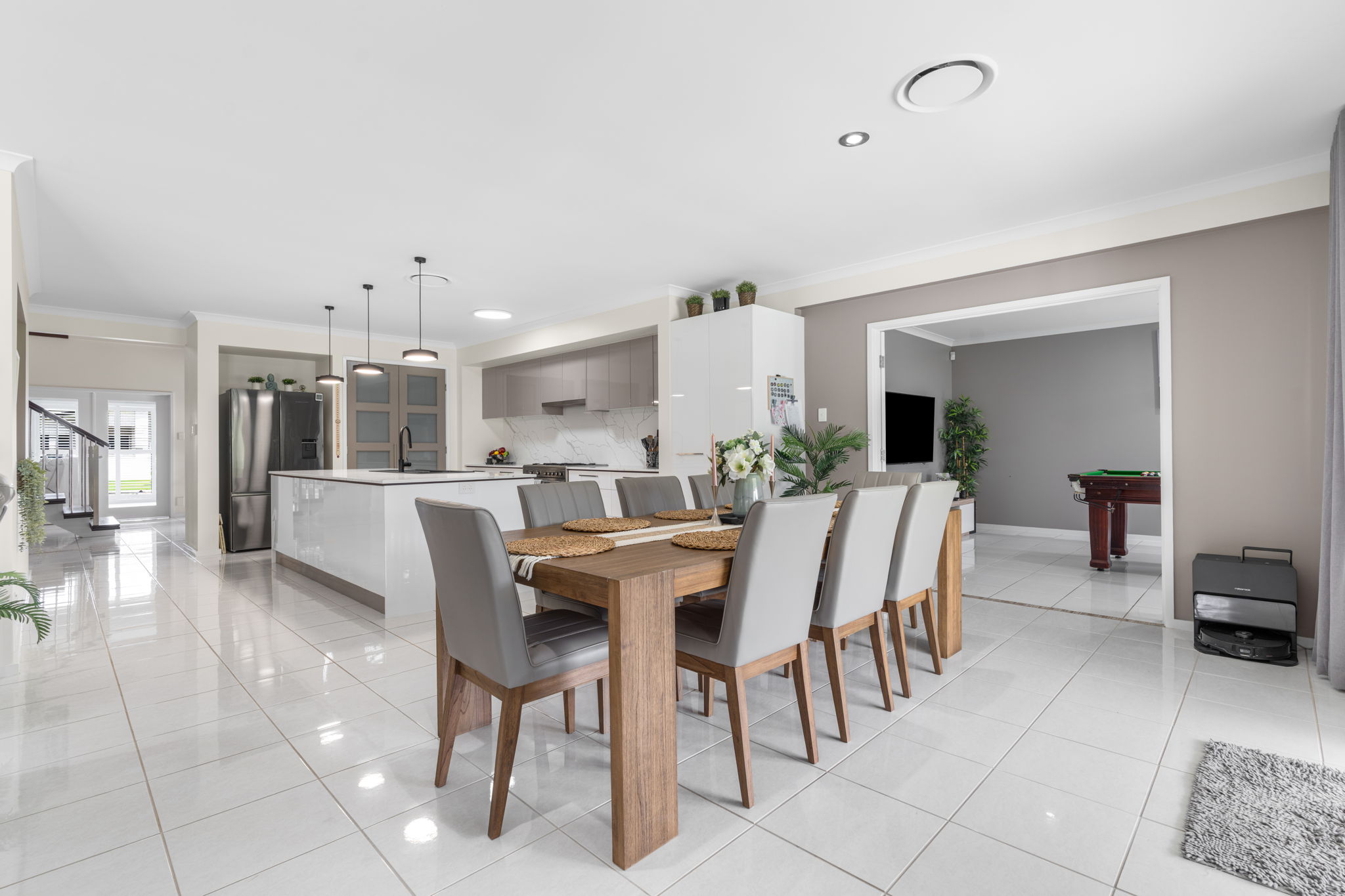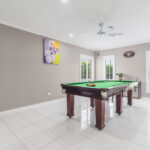The well-appointed, modern custom kitchen boasts high-end appliances, ample storage, and elegant features, with a stunning marble backsplash and benchtops. Plantation shutters line each window throughout the home, allowing through warm natural light and sophistication. This space leads to a separate billiard room, which hosts the versatility for you to alter the room to your specific needs, like a formal dining room, media room or studio – the opportunities are endless!