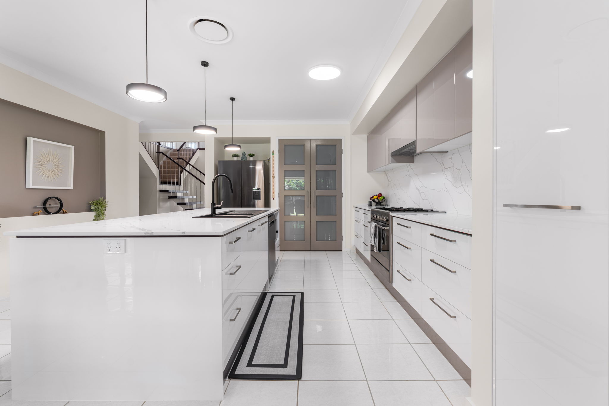 • Large modern kitchen with gas cooktop (dual fuel), island, marble benchtops and backsplash