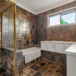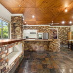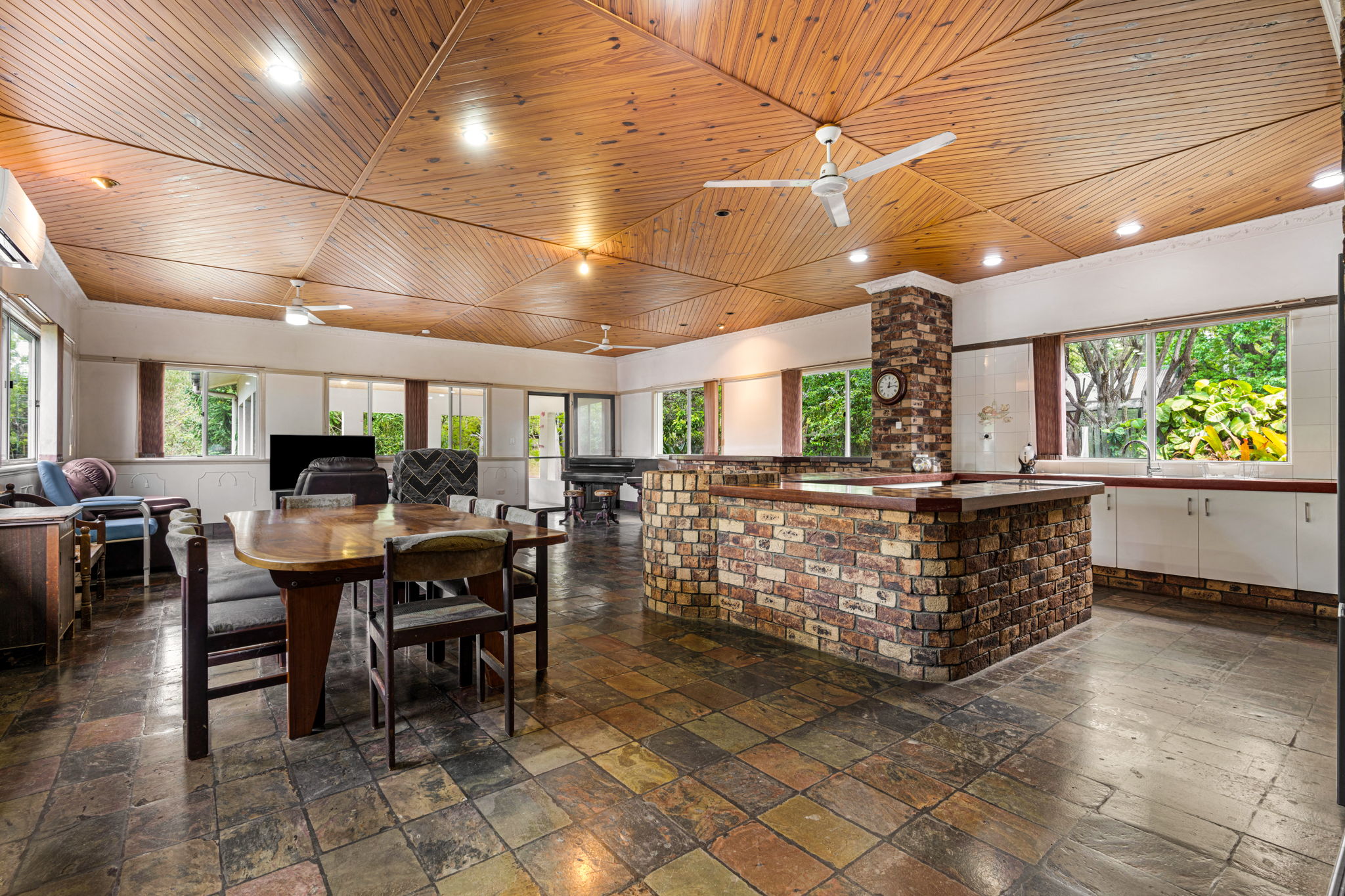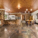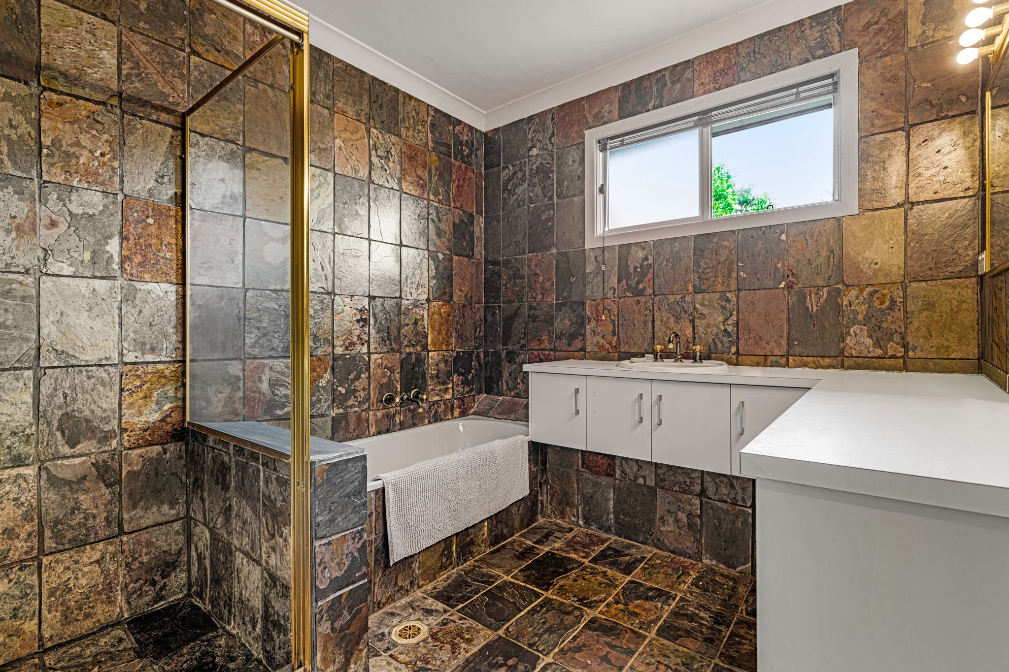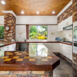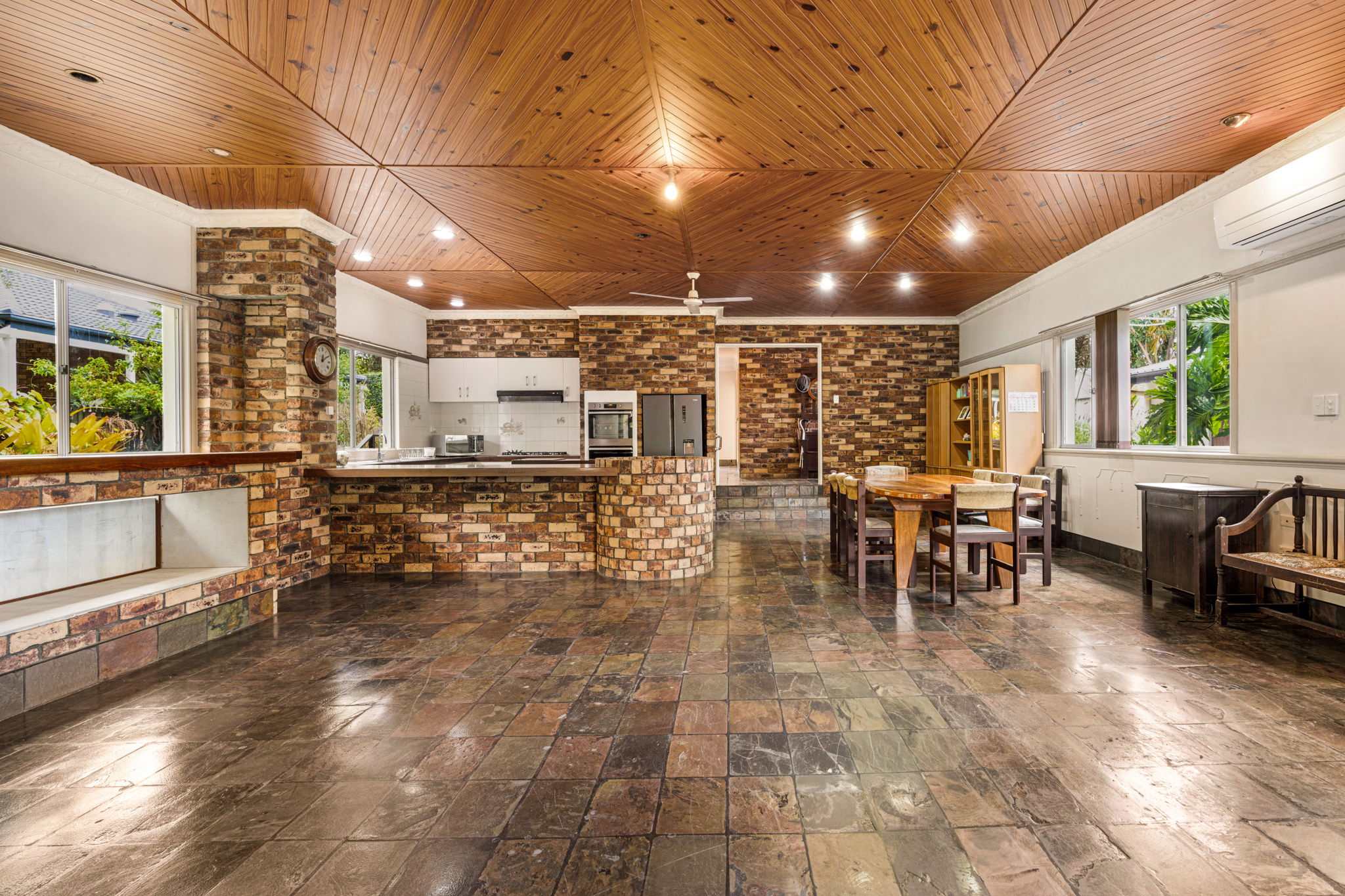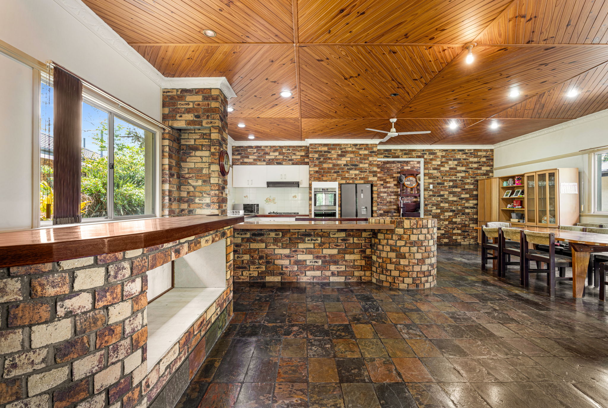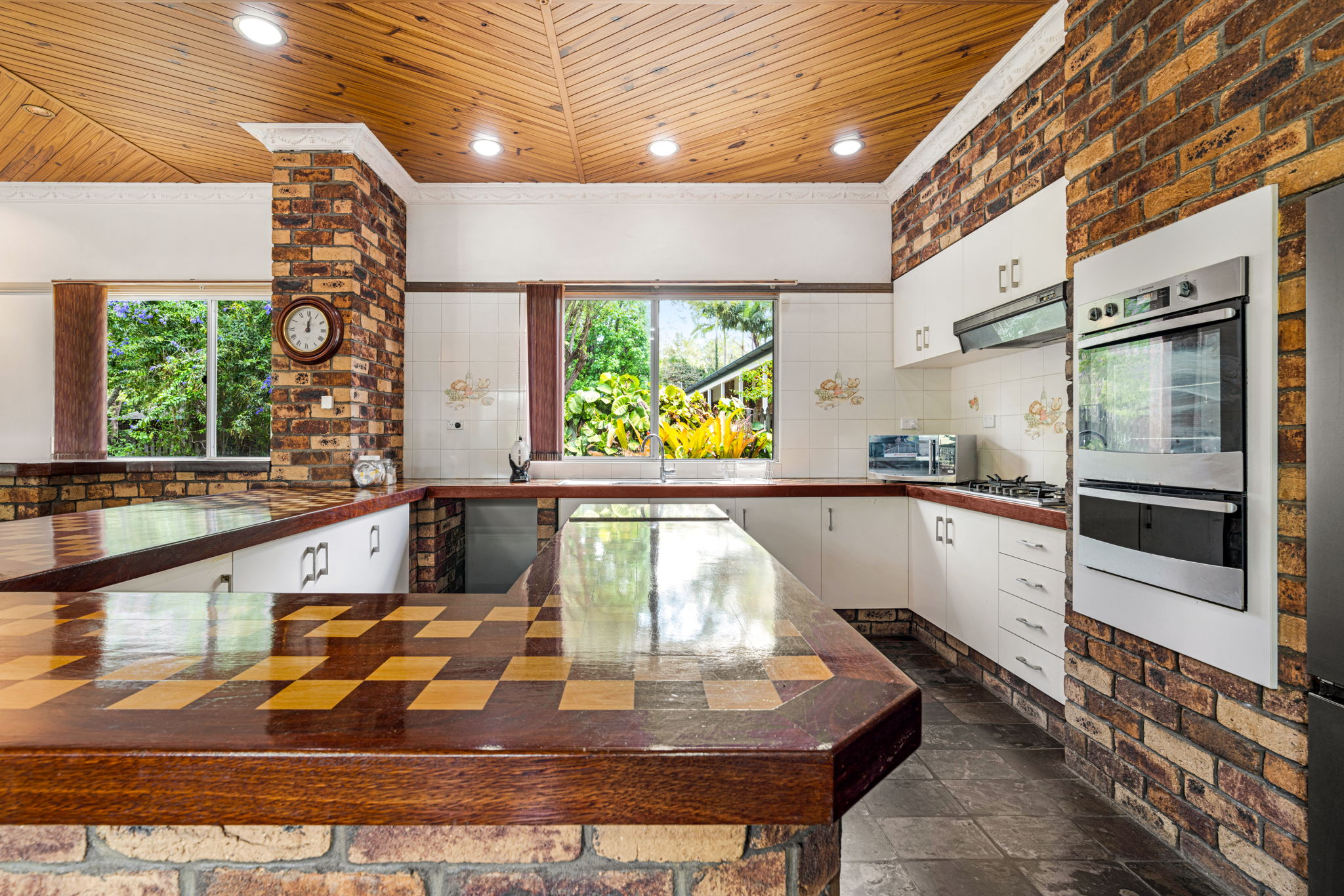 The living areas flow directly onto a large, covered patio, providing a clear view over the expansive front yard and lengthy driveway. The kitchen, living and dining areas also feature exposed brick and slate stone tiles, creating a warm, rustic atmosphere. The kitchen boasts ample storage, modern appliances and highly functional solid timber bench tops with unique chess board design that warp-around the island and bar, entertaining here is a breeze.