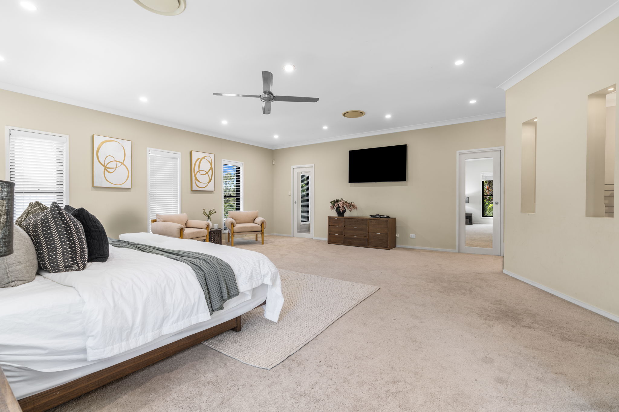This spacious residence features eight bedrooms and four bathrooms, making it ideal for large families, multigenerational households, or anyone in need of extra rooms for hobbies, a home business / office, or a studio. The thoughtful floorplan includes areas currently configured as a gym, office, and media room, giving you the flexibility to redesign spaces as you wish. The grand master suite, set across the entire upper level, offers unparalleled privacy with a dual walk-in robe, private office, and ensuite with a spa bath. Three additional bathrooms and a powder room service the remaining bedrooms and living quarters, with two providing dual access and one offering a dedicated ensuite – accommodating a variety of family arrangements and guest needs.