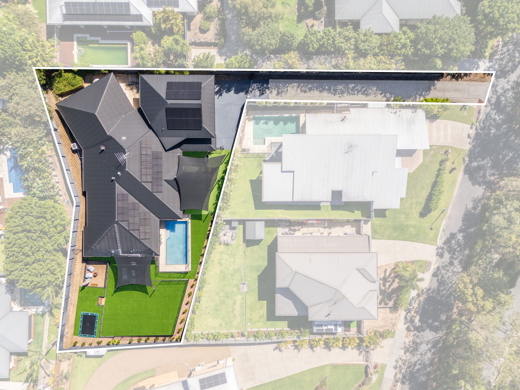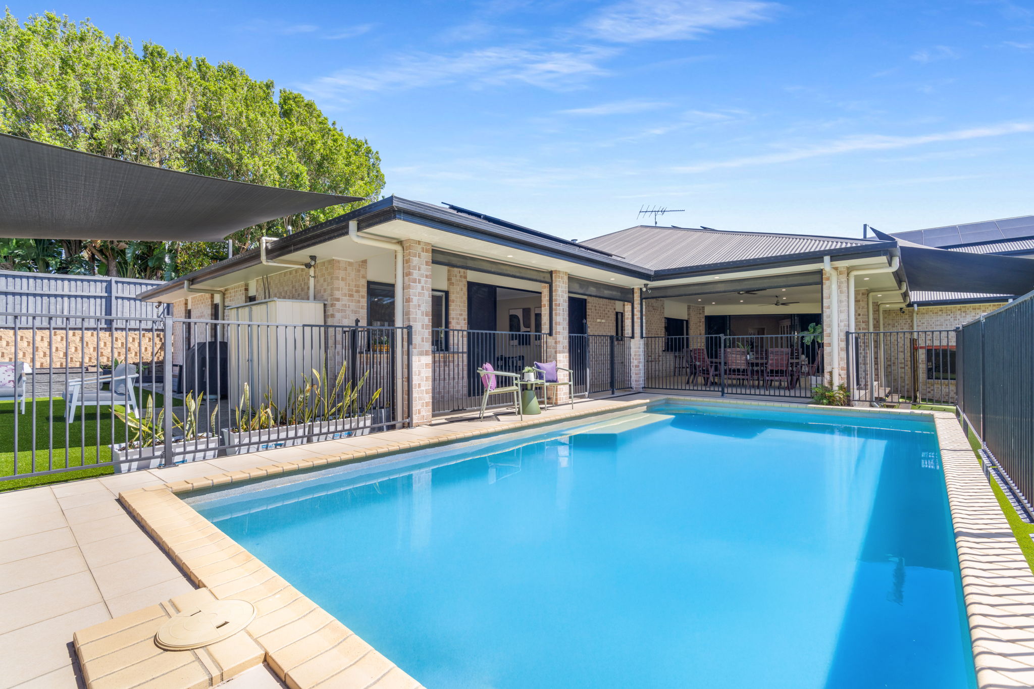 Outside, you’ll find a covered alfresco area overlooking a large backyard and an inground swimming pool. Additional features include a covered play area with a custom playground, a purpose-built firepit with built in seating, an inground trampoline with protection matting, and a dedicated outdoor lounging terrace shaded by a sail. This no maintenance backyard caters to everyone in the family with plenty of versatility to creating your desired space.