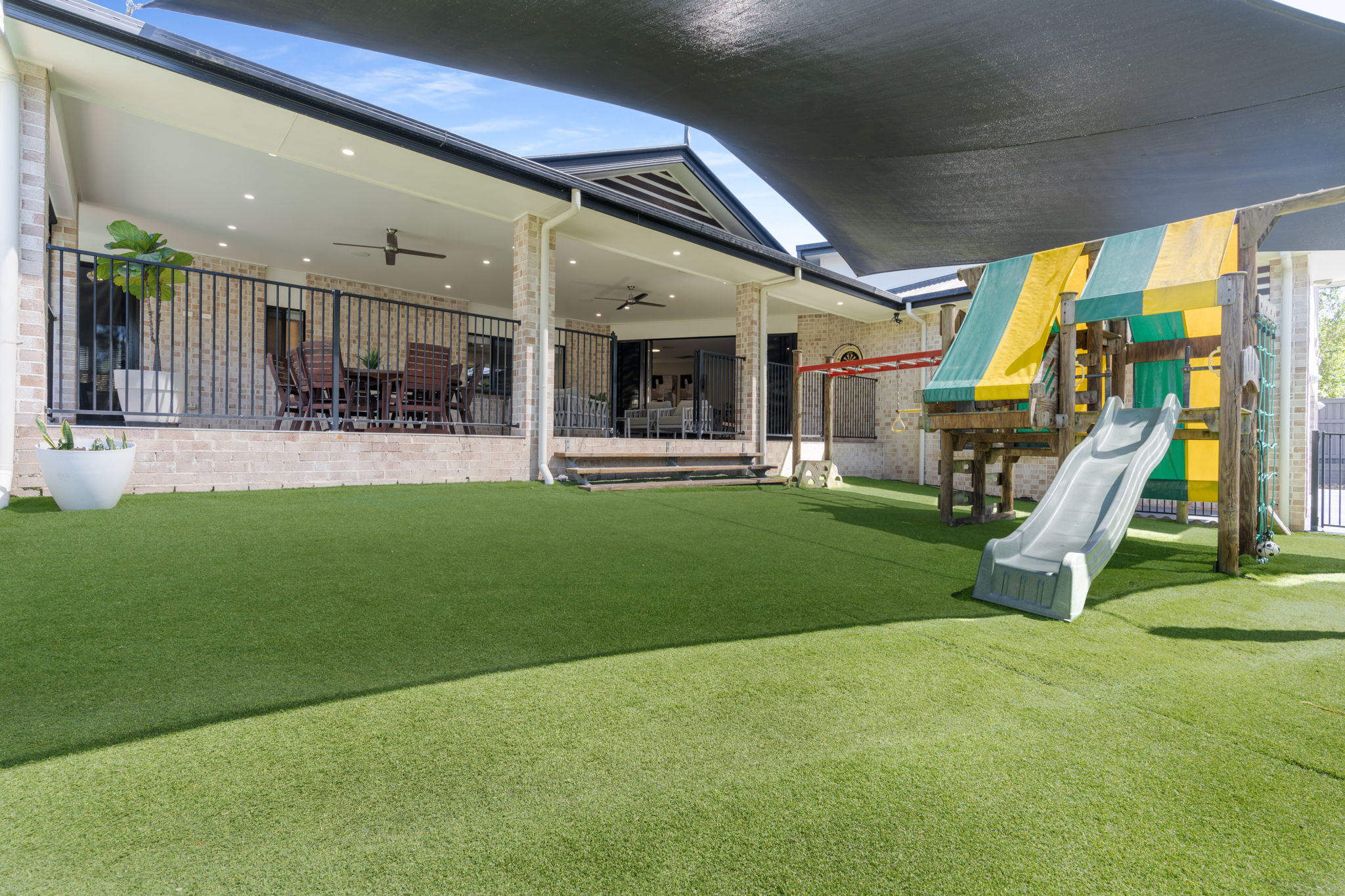 • Shade sail-covered outdoor play area with custom playground