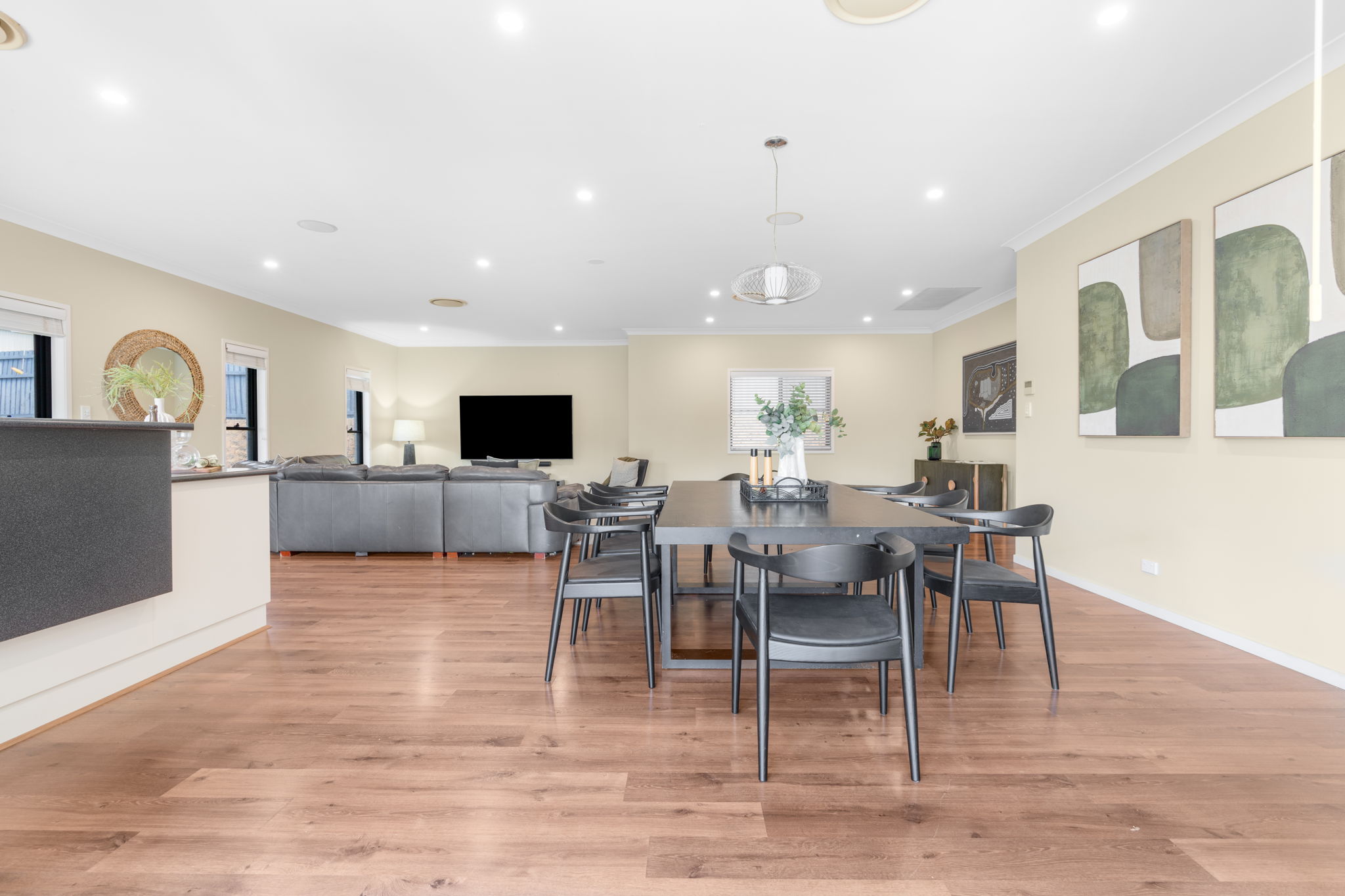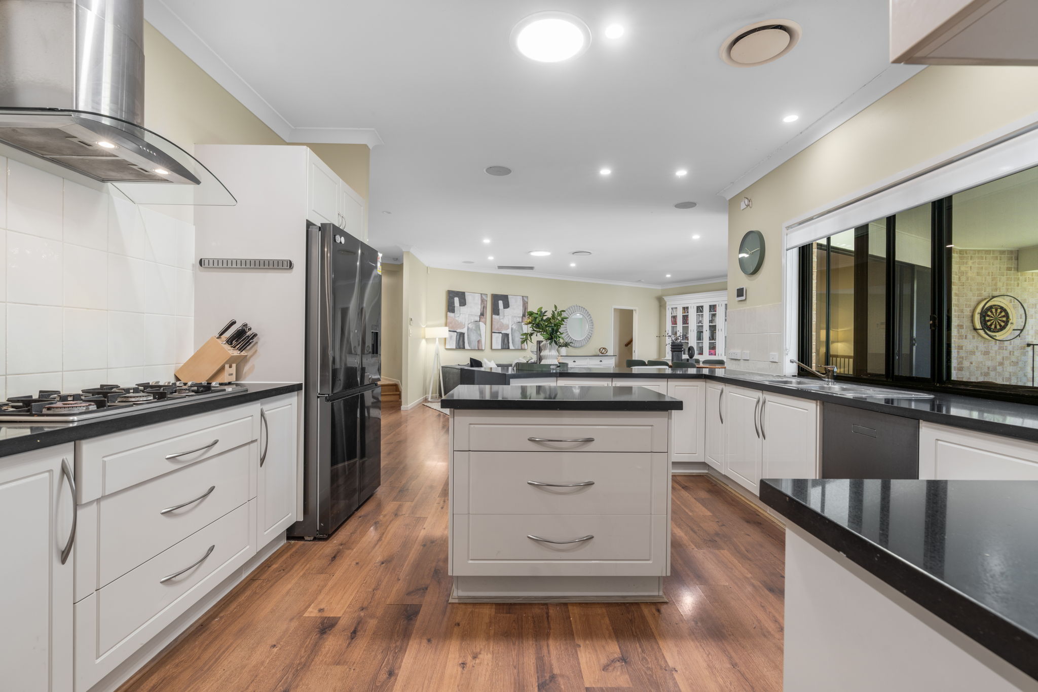 The open-plan living and dining area invites you to create a comfortable gathering space tailored to your lifestyle. In the heart of the home, the centralised kitchen with wrap around benches and cabinetry offer plenty of storage. There is a kitchen island equipped with modern appliances and complemented by a enormous walk-in pantry and breakfast bar, all catering for a large family who entertain. In the dual living wing, a second full sized kitchen is on offer, complete with a dining room and large living room all overlooking the entertainment area and inground pool.